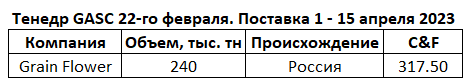 Египет провел очередной тендер по закупке зерна 22-го февраля. Будут осуществлены закупки зерна российского происхождения в размере 240 тысяч тонн у компании Grain Flower с поставкой с 1 по 15 апреля. Победитель предложил цену в размере 317.50 долларов за тонну на условиях C&F.