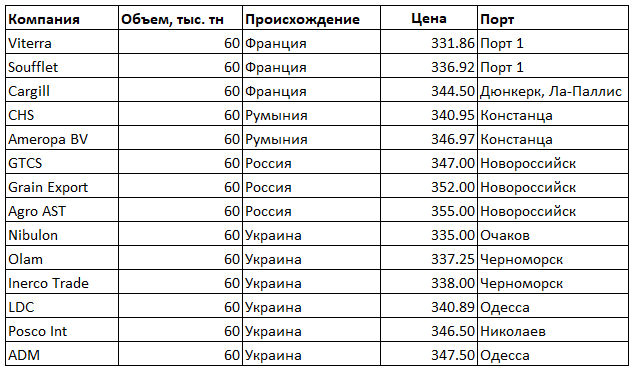 Наибольшее количество заявок поступило от экспортеров из Украины. В данном тендере принимают участие так же Франция, Россия и Румыния. Наименьшее предложение поступило от экспортеров из Франции (Viterra) FOB 331.86$. Оплата за поставленное зерно будет производиться с помощью аккредитива и 180-дневной отсрочки платежа.