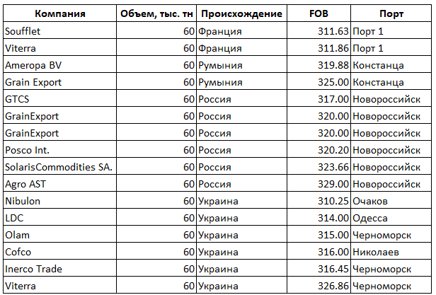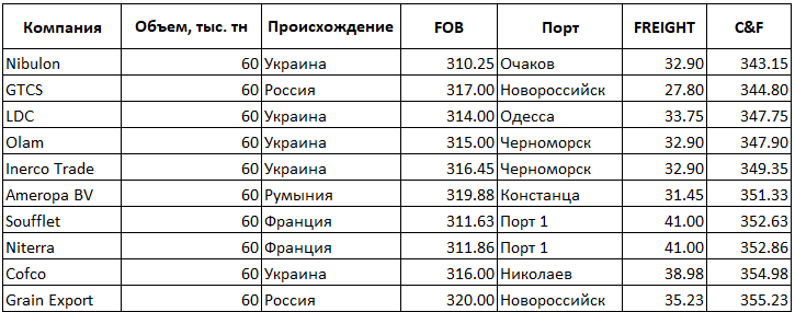 Заявки поступили от экспортеров из Франции, Украины, Румынии и России. Наименьшее предложение (FOB) в размере 310,25$ поступило от компании Nibulon (Украина). Оплата за поставленное зерно будет производиться с помощью аккредитива и 180-дневной отсрочки платежа.