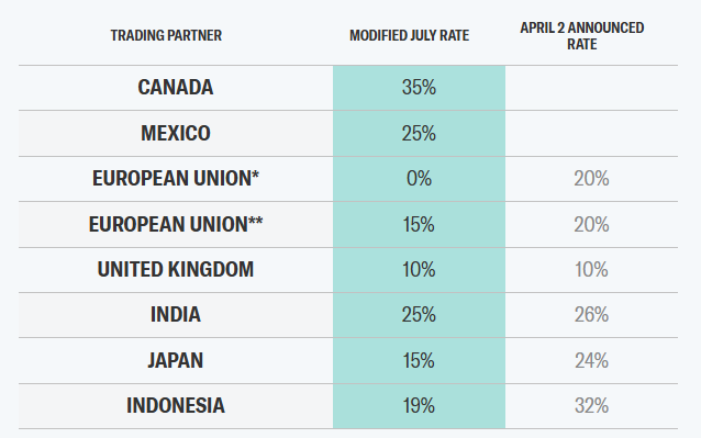 Индия, после неоправдавшихся надежд на сделку, столкнется с 25-процентной ставкой, хотя у участников переговоров, похоже, есть еще неделя для внесения предложений. Тайвань является еще одним крупным торговым партнером США, и его ставка составит 20%.