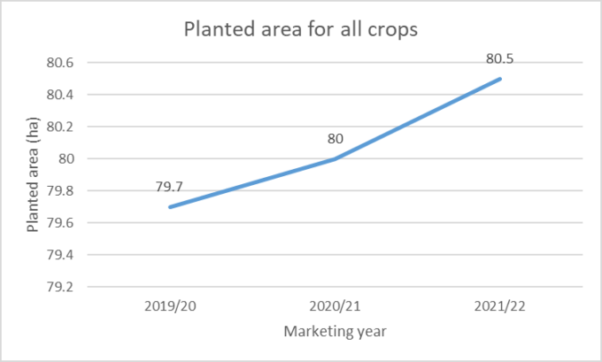 Общая посевная площадь всех зерновых культур в Российской Федерации имеет тенденцию к росту. Согласно данным Минсельхоза, общая посевная площадь всех культур в 2019 году составила 79,7 млн. га и постепенно выросла до 80 млн. га в 2020 году и 80,5 млн. га в 2021 году. Представительство USDA в Москве ожидает, что эта тенденция сохранится в 2022 году.