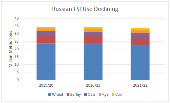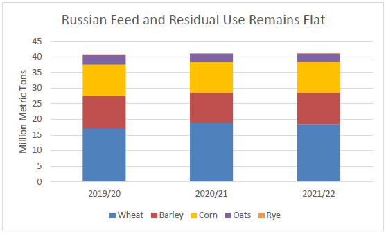 Несмотря на экспортные ограничения и, как следствие, обильное предложение на внутреннем рынке России, прогнозируется, что ухудшение экономических перспектив снизит потребление пшеницы в 2021/22 МГ. Прогнозируется сокращение продовольственного и промышленного потребления в связи со снижением спроса на продукты из пшеничной муки и увеличением доступности других зерновых, таких как ячмень и рожь. Прогноз кормового и остаточного потребления снижен в связи с уменьшением урожая и ожидаемым ростом потребления кукурузы и ячменя.