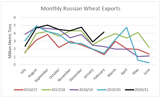 Наиболее активно российская пшеница в период с июля 2020 года по февраль 2021 года экспортировалась в Египет (7,4 миллиона метрических тонн) и Турцию (6,2 миллиона метрических тонн). Прогнозируется, что экспорт пшеницы будет ограничен 40 миллионами. тонн в 2021/22 МГ из-за ограничительной политики в отношении экспорта. Этот объем экспорта будет зависеть от того, как долго будет действовать плавающая пошлина и останутся ли мировые цены выше уровней, для которых действует пошлина.