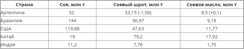 При этом прогноз объема мирового производства соевого шрота в 2021/22 МГ ожидается на уровне 260,63 млн т, что на 0,31 млн т больше предыдущего прогноза, соевого масла на уровне — 62,32 млн т, что всего на 0,08 млн т боше прогнозируемых в июне.
