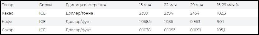 Котировки какао к 22 мая продолжали снижаться с 2399 до 2394 долларов за тонну, но к 29 мая резко поднялись до 2454 долларов за тонну. Котировки кофе снижались весь период, сначала с 1,0685 до 1,036 доллара за фунт, а затем до 0,963 доллара за фунт. Котировки сахара 15 по 22 мая выросли с 0,1038 до 0,1093 доллара за фунт, но потом отыграли назад до 0,1091 доллара за фунт.