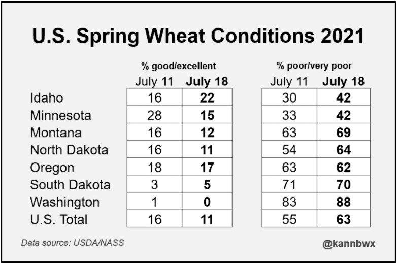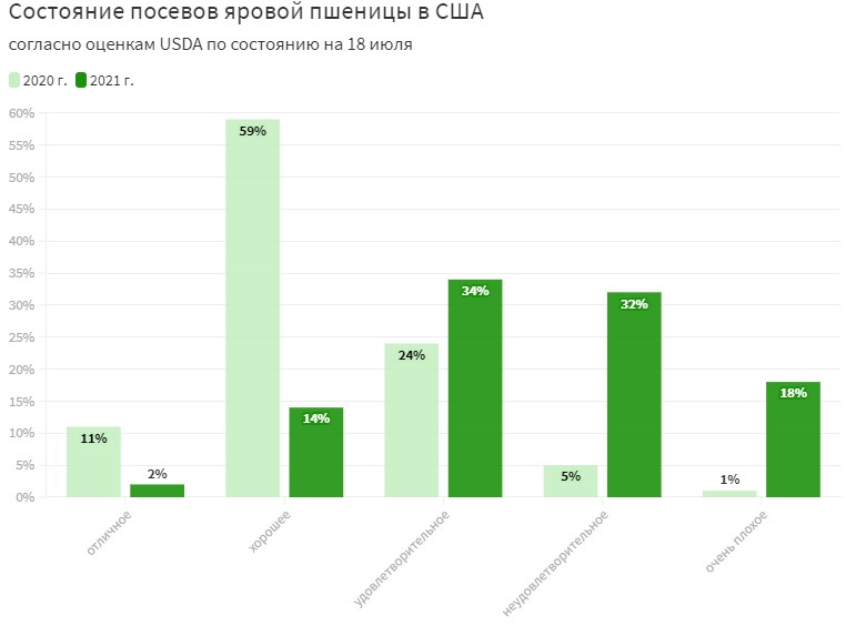 «Ситуация для яровой пшеницы в США, к сожалению, ухудшилась: по состоянию на воскресенье всего 11% хороших/отличных (1% отличных) и 63% плохих/очень плохих посевов. Лидирующий производитель Северная Дакота упал на 5 пунктов до 11%, а второй Монтана — на 4 пункта до 12%. Миннесота снизилась на 13 пунктов до 15%», — прокомментировала глобальный обозреватель по сельскому хозяйству в Thomson Reuters Карен Браун (Karen Braun) в Twitter.