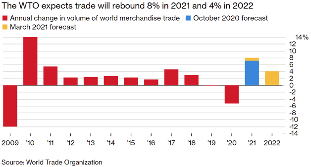 Всплеск спроса на товары во второй половине 2020 г. помог уравновесить первоначальный сбой от Covid-19 в мировой торговле и привел к более приглушенному ежегодному спаду, чем великая рецессия, когда мировая торговля товарами сократилась на 12%, а ВВП — на 2%.