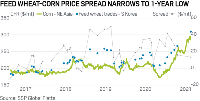 Разрыв цен на фуражную пшеницу и кукурузу сократился с пика в 34 доллара за тонну 27 августа до примерно 13 долларов за тонну 18 февраля. Это побудило покупателей кормов в Южной Корее задуматься, не пора ли отказаться от кукурузы в пользу фуражной пшеницы.