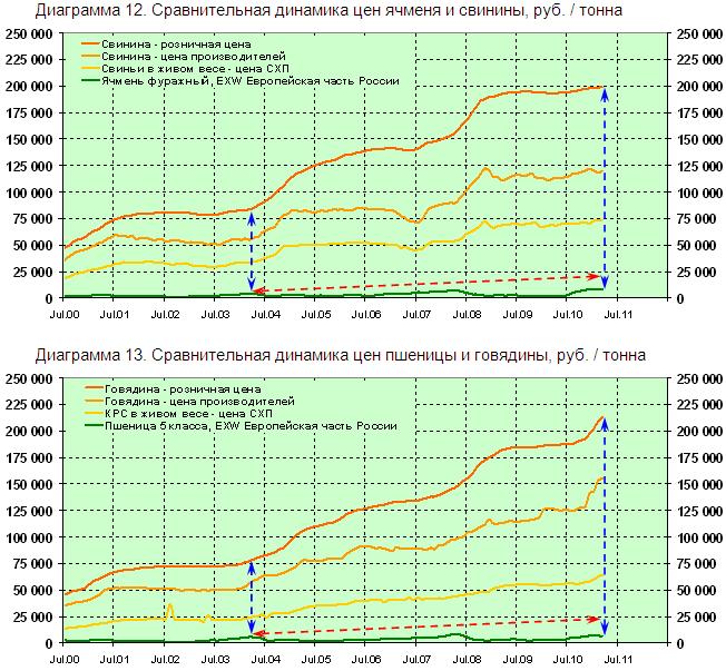* — синие стрелки, разница между розничной ценой птицы и мяса и ценой реализации зерна