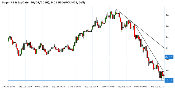 Аналитики отмечают, что рынок находится в состоянии перепроданности, поэтому пока нет оснований рассчитывать на устойчивую положительную динамику. Уровень поддержки для майского фьючерса поддержки определен экспертами на уровне 16.00 центов, уровень сопротивления – на уровне 18.00 центов за фунт.