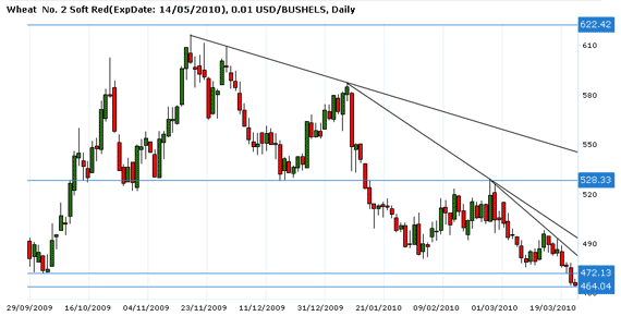 В минувшую пятницу контракты на пшеницу на американской товарной бирже CBOT в Чикаго вновь обновили минимумы. Майская пшеница завершила торговую сессию понижением на 1.75 цента на отметке 464.75 цента за бушель. На торгах в Канзас-Сити аналогичный контракт потерял в цене 1.25 цента и закрылся на отметке 475.50 цента за бушель. Наконец, майская пшеница в минувшую пятницу в Миннеаполисе подешевела до 497 центов за бушель, потеряв 0.75 цента.