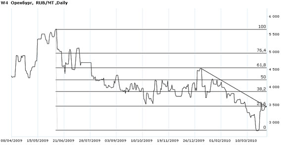 В Оренбургской области на рынке затишье. Стоимость пшеницы 3 класса -3400-3600 руб./т, пшеницы4 класса -3100 руб./т, пшеницы 5 класса — 2700-2900 руб./т.