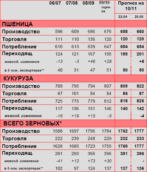 Основываясь на текущих прогнозах, можно предположить, что в 2010/11 году производство и потребление будут в целом сбалансированы и конечные запасы, таким образом, останутся на уровне этого года, составляющем 396 млн тонн, что на 5 млн тонн превышает первоначальный апрельский прогноз.