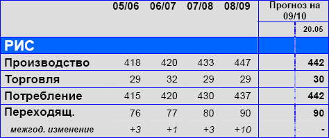 Согласно оценкам, в 2009/10 году мировое производство риса впервые за 7 лет сократится на 1% до 442 млн тонн, что обусловлено главным образом снижением основного урожая в Индии. Потребление риса возрастет в соответствии с тенденцией роста населения Земли на 1% и также составит 442 млн тонн.