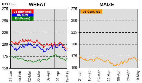 В мае перспективы мирового производства зерна в 2010/11 году, особенно кукурузы, значительно улучшились. В результате повышения прогнозов для ряда стран, особенно США, общий объем производства теперь составляет 1 777 млн тонн, что меньше прошлогодних 1 784 млн тонн, но примерно на 15 млн тонн превышает прогноз месячной давности.