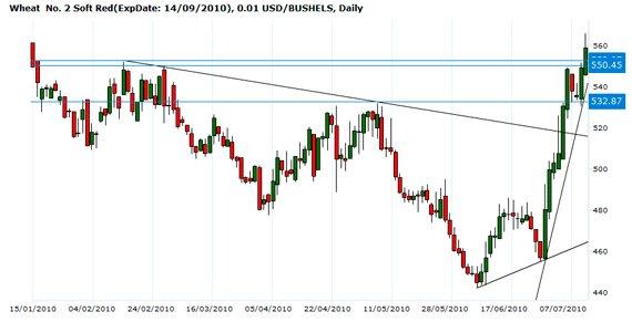 Воздействие жары на урожай зерна в России обсуждается даже в очередях московских магазинов. Собственно, а где же ещё, кроме кухни, разумеется, поговорить о хлебе насущном? Сегодня пенсионеры даже пробовали отгадать, на сколько сократится нынешний урожай. Озвучивалась цифра в 20%. Любопытно было наблюдать, как незатейливые рассуждения столичных бабушек почти совпали с прогнозами таких грандов аналитической мысли, как Александр Бос из лондонской Маккуори Групп, Люк Чэндлер из голландского Рабобанка и Тим Буш из Меррилл Линч. Если верить экспертным оценкам, то урожай пшеницы в этом году может оказаться меньше 50 млн тонн. Российский экспорт может сильно пострадать, а одновременное сокращение посевов в Канаде только закрепит за США положение лидера по поставкам хлеба на международные рынки. Такие радужные перспективы окрылили трейдеров в Чикаго, а заодно и котировки на пшеницу, взлетевшие на самые высокие за последние полгода уровни.