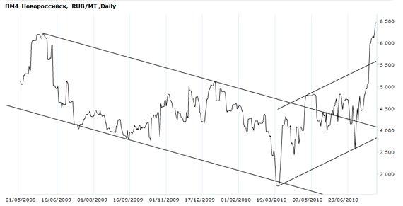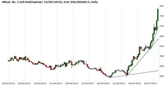 Сельскохозяйственные рынки планеты переживают стадию роста и играть на понижение мало кто отваживается. Trend is your friend, а друзьями, как известно, не разбрасываются. В пятницу на пшеничной площадке в Чикаго имела место коррекция. Рынок откровенно перекуплен. Обладатели длинных контрактов за лето «наварили» такую прибыль, что не зафиксировать её было бы просто неразумно. Основная цель, 747, достигнута и перед выходными можно снять напряжение. Небольшая передышка необходима также для того, чтобы осмотреться вокруг. Основные потребители пшеницы в Азии и Африке спешат дополучить товар. Возрастающее значение приобретают поставки из США. За последнюю пару недель экспортные продажи американской пшеницы достигли 1.8 млн тонн. Прошедшей весной американцам удавалось продавать в среднем не более, а часто и менее 400 тыс. тонн. Любопытно, что Египет, самый крупный импортёр пшеницы в мире, и прежде всего, из России, начал осуществлять форвардные покупки этого злака. Что бы это значило? Неверие в российский потенциал? Возможно. Жара в России продолжается. Наступает время сева озимых, однако в некоторых регионах состояние прокалённой солнцем и истрескавшейся почвы не вызывает энтузиазма хлеборобов. По рынку ходит слух, что в России на 20%-30% площадей озимые сеять нельзя. То есть, в принципе, можно бросить на землю семена, но они не взойдут. Поэтому действие правительственного запрета на экспорт пшеницы может быть даже продлено. По предварительным оценкам трейдеров площадь под российскими озимыми может сократиться на 20%-30%. Условия же для сева яровых следующей весной могут сильно зависеть от капризов природы и египтяне, вероятно, решили не рисковать и начать обеспечивать себя хлебом из более традиционного источника.