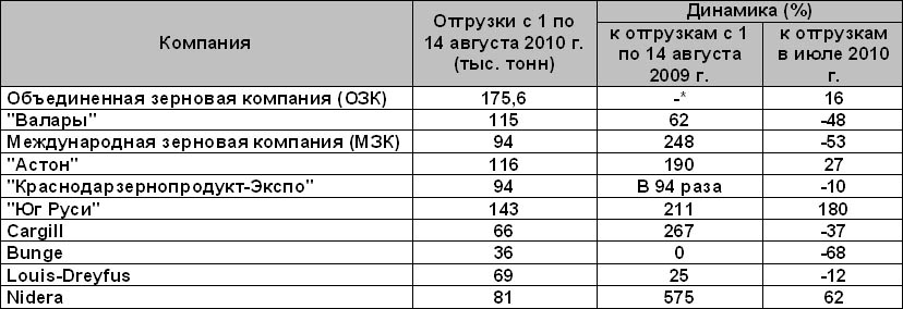 Поскольку о запрете экспорта было объявлено 5 августа, то у трейдеров оставалось окно с 5 по 14 августа, чтобы отгрузить максимальные объемы. По предварительной статистике ФТС экспорт зерновых из России с 1 по 14 августа составил примерно 1,6 млн тонн (из них — 1,5 млн тонн пшеницы и 85 тыс. тонн ячменя), тогда как за тот же период 2009 года было отгружено всего 749 тыс. тонн (из них — 620 тыс. тонн пшеницы и 97 тыс. тонн ячменя). За период с 1 июля по 14 августа было вывезено 3,6 млн тонн зерновых (в том числе 3,3 млн тонн пшеницы и 252 тыс. тонн ячменя), что на 1,5 млн тонн больше показателя прошлого года.