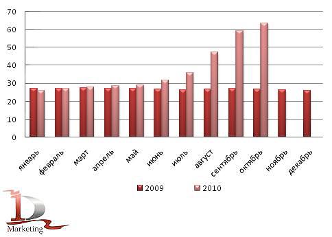 Динамика средних потребительских цен на гречневую крупу в 2009 — октябре 2010 гг. (руб./кг):
