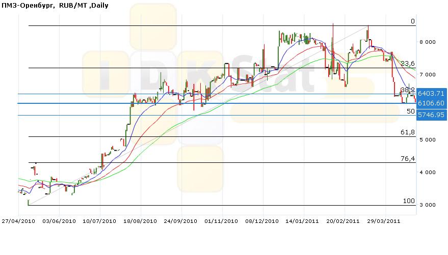 График движения цены на пшеницу 3-го класса по базису Оренбург продолжает следовать боковому тренду в пределах уровня поддержки 6100 и уровня сопротивления 6400 руб/тн. Велика вероятность пробития уровня поддержки и снижения значения котировки до следующего уровня поддержки 5750 руб/тн.