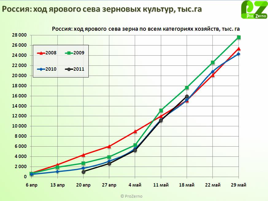 Вот так выглядит динамика ярового сева. Черная линия — это динамика ярового сева в целом по России в текущем году, и, что самое интересное, она становится лучше, чем в 2008, том самом году рекордного урожая, объемом более 100 млн. тонн.