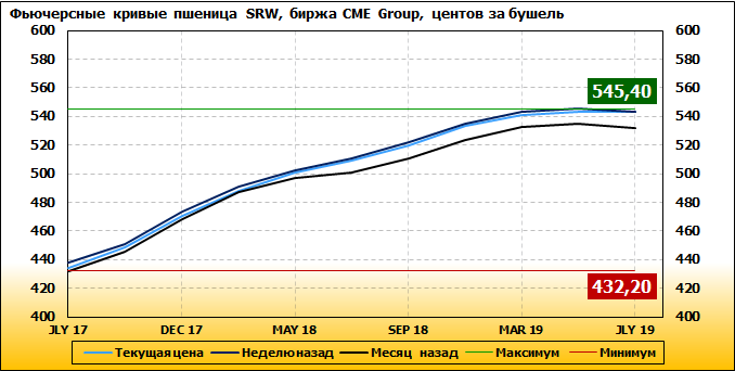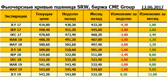 На 12.06.2017 стоимость пшеницы SRW на бирже CME Group по контракту JLY 17 составила 434 цента за бушель. За прошедшую неделю стоимость пшеницы SRW упала на 4,2 цента/бушель. Как мы видим на графике, фьючерсная кривая имеет периоды, когда более дальний фьючерс дешевле ближнего.