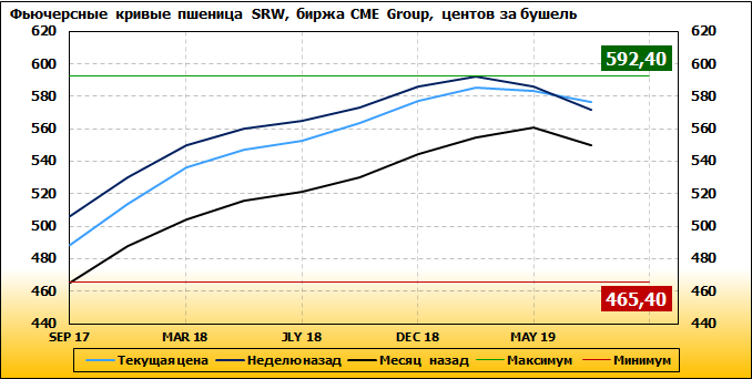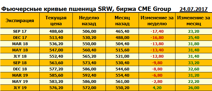 На 24.07.2017 стоимость пшеницы SRW на бирже CME Group по контракту SEP 17 составила 488,6 центов за бушель. За прошедшую неделю стоимость пшеницы SRW упала на 17,4 центов/бушель. Как мы видим на графике, фьючерсная кривая имеет периоды, когда более дальний фьючерс дешевле ближнего.