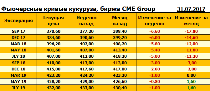 На 31.07.2017 стоимость кукурузы на бирже CME Group по контракту SEP 17 составила 370,6 центов за бушель. За прошедшую неделю стоимость кукурузы на площадке CME Group упала на 6,6 цента/бушель.