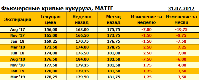 На 31.07.2017 стоимость пшеницы Milling Wheat на бирже MATIF по контракту Aug ’17 составила 156 евро за тонну. За прошедшую неделю стоимость кукурузы на европейской площадке упала на 7 евро/тонна.
