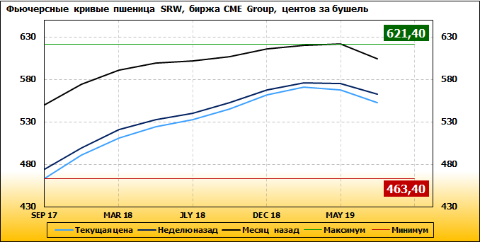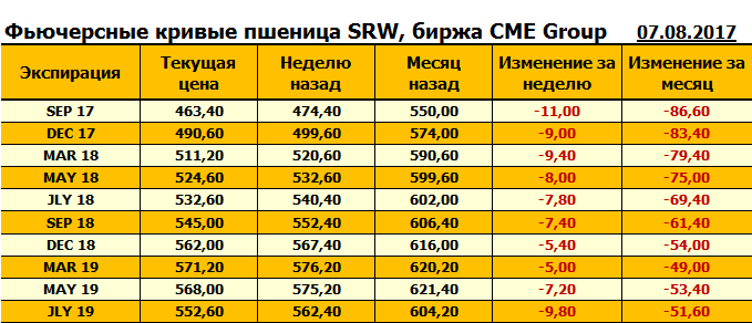На 07.08.2017 стоимость пшеницы SRW на бирже CME Group по контракту SEP 17 составила 463,4 цента за бушель. За прошедшую неделю стоимость пшеницы SRW упала на 11 центов/бушель. Как мы видим на графике, фьючерсная кривая имеет периоды, когда более дальний фьючерс дешевле ближнего.