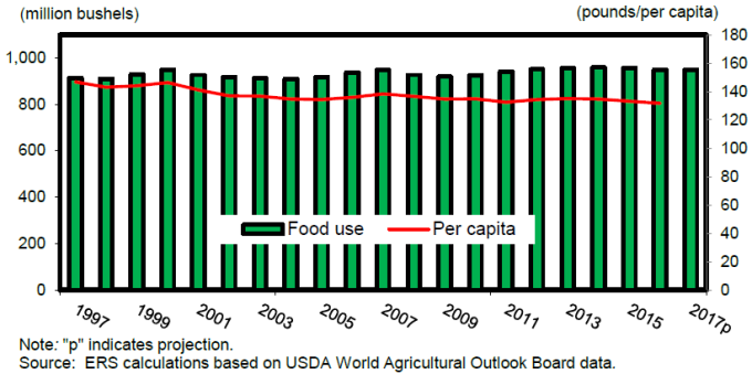 С 2014/15 года пищевое потребление пшеницы снижается. В 2014/15 году пищевое потребление в США оценивалось в 958 миллионов бушелей и соответствовало потреблению муки на уровне 134,7 фунта на душу населения. В каждом последующем году снижалось как совокупное продовольственное потребление, так и потребление на душу населения. В 2016/17 году пищевое потребление пшеницы составило 949 миллионов бушелей и 131,7 фунтов на душу населения. В последние годы прирост населения в Соединенных Штатах не был достаточным, чтобы компенсировать снижение потребления на душу населения, происходящее в результате изменения вкусов и предпочтений. Прогноз продовольственного потребления пшеницы в 2017/18 маркетинговом году в этом месяце снижен на 5 миллионов бушелей до 950 миллионов.