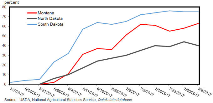 Значительная часть дурума, как и прочей яровой пшеницы, выращивается на северных равнинах и ее урожайность также пострадала в аномально жаркие и сухие летние месяцы. С июля по август NASS снизил урожайность дурума в США на 3,7 процента, со значительным снижением для Монтаны (-6 бушелей на акр по сравнению с предыдущим месяцем и -24 бушеля по сравнению с 2016 годом) и Северной Дакоты (-3 бушеля на акр по сравнению с предыдущим месяцем и -17 бушелей относительно 2016 года).