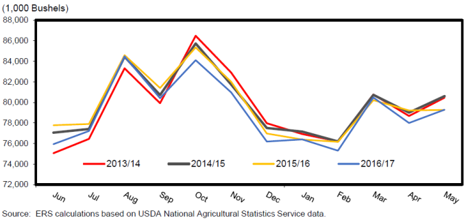 После публикации отчета о мукомольной продукции USDA-NASS от 1 августа стала понятна полная картина использования пшеницы в пищевых целях в 2016/17 маркетинговом году. На протяжении большей части 2016/17 маркетингового года продовольственное потребление пшеницы было ниже предыдущих лет (рисунок 3). Снижение среднего содержания протеина в урожае HRW 2016/17 года поддерживало ценовые премии для пшеницы HRW с высоким содержанием протеина и стимулировало максимизацию эффективности переработки пшеницы.