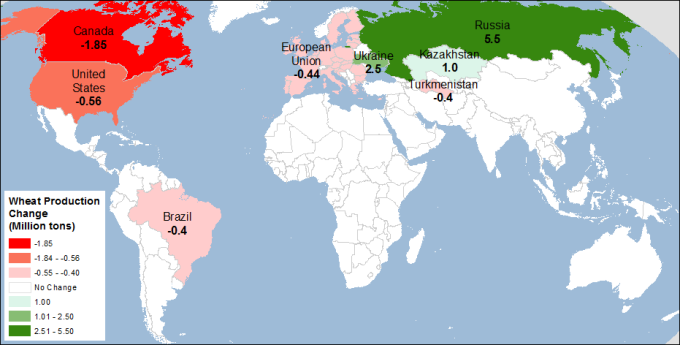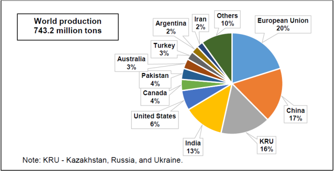 Прогнозируемое производство пшеницы в странах КРУ (Казахстан, Россия и Украина) в этом месяце увеличено на 9,0 млн. тонн до 118,0 млн. Прогнозируемое производство пшеницы в России в этом месяце увеличено на 5,5 млн. тонн до 77,5 млн., даже при сокращении площади пшеницы на 0,5 млн. гектаров. Урожай озимой пшеницы убран примерно на 60 процентов. В регионах Южного и Северного Кавказа, которые производят 65 процентов озимой пшеницы в России, уже собрано около 90 процентов урожая. Отчеты об уборке урожая свидетельствуют о высокой урожайности, которая на 6 процентов превышает прошлогоднюю, хотя на тот момент она была рекордной для России. Рассчитанный для яровой пшеницы нормализованный разностный индекс растительности (NDVI) предполагает близкую к рекордной урожайность в Приволжском районе и в основных регионах-производителях пшеницы в Сибири.