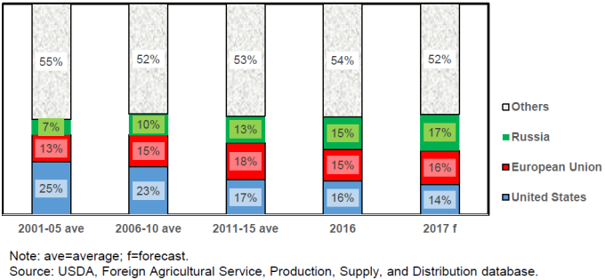 Ожидаемый рекордный урожай пшеницы в России и высокая конкурентоспособность по цене (причерноморская пшеница в настоящее время является самой дешевой в мире), согласно прогнозу, приведут к тому, что Россия сменит Европейский союз в качестве крупнейшего в мире экспортера пшеницы. Россия и ЕС неуклонно наращивают долю рынка за счет США. До 2013/14 года Соединенные Штаты, как правило, становились крупнейшим в мире экспортером пшеницы. В 2016/17 году они вернули первое место, но, по всей видимости, не останутся на нем. Прогноз гласит, что Соединенные Штаты станут третьим по величине экспортером в 2017/18 году после России и ЕС.