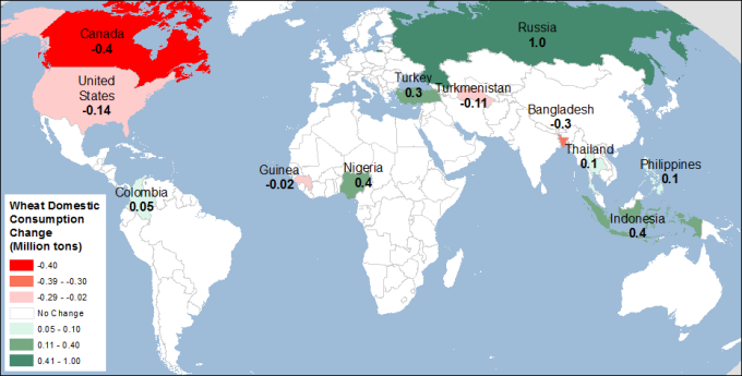 Прогноз потребления пшеницы на 2017/18 год за пределами США повышен в этом месяце на 1,8 млн. тонн до 737,1 млн. Ожидается, что выдающийся урожай пшеницы увеличит кормовое и остаточное потребление пшеницы в России, прогноз которого повышен на 1,0 млн. тонн в этом месяце. Прогноз кормового потребления пшеницы в Индонезии увеличен на 0,4 млн. тонн. Страна обходит действующий запрет на импорт кормовой пшеницы, импортируя большое количество дешевой, низкокачественной продовольственной пшеницы для использования ее в кормовых целях. Противоположные изменения прогноза кормового и остаточного потребления пшеницы сделаны для Турции и Канады, что отражает более низкое качество урожая в Турции и сокращение производства пшеницы в Канаде. Небольшие изменения также внесены для ряда стран в этом месяце (см. карту 2).