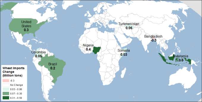 Карта 4. Изменения импорта пшеницы для 2017/18 торгового года, август 2017