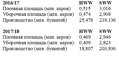 На уровне 222,6 млн. бушелей совокупное производство твердой и мягкой белозерной озимой пшеницы (HWW и SWW) выросло на 3 процента по сравнению с июльским прогнозом, хотя на 23 миллиона бушелей меньше, чем в 2016 году. Улучшение состояния посевов в крупных штатах-производителях белозерной пшеницы, включая Орегон и Вашингтон, поддерживают увеличение объемов производства.