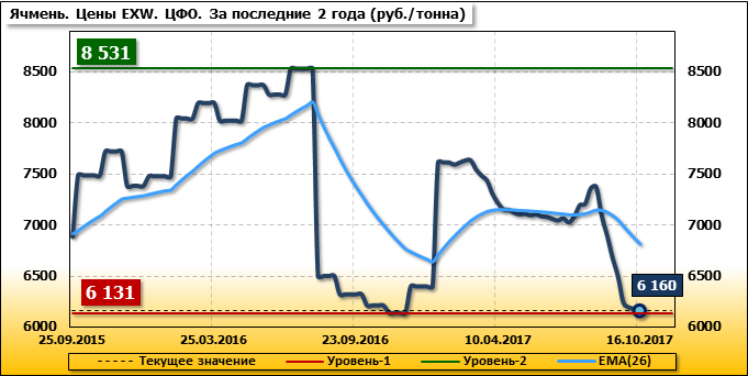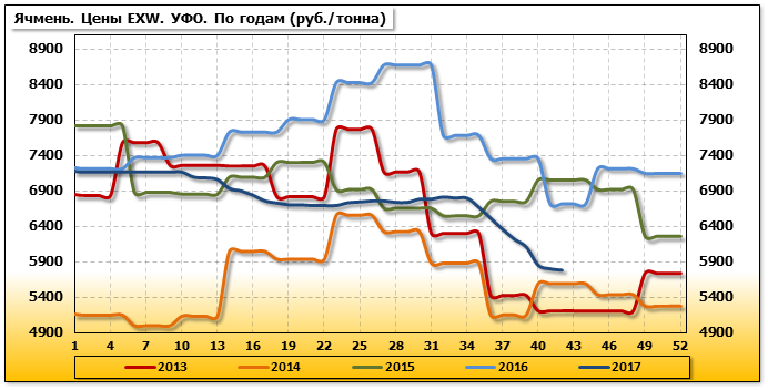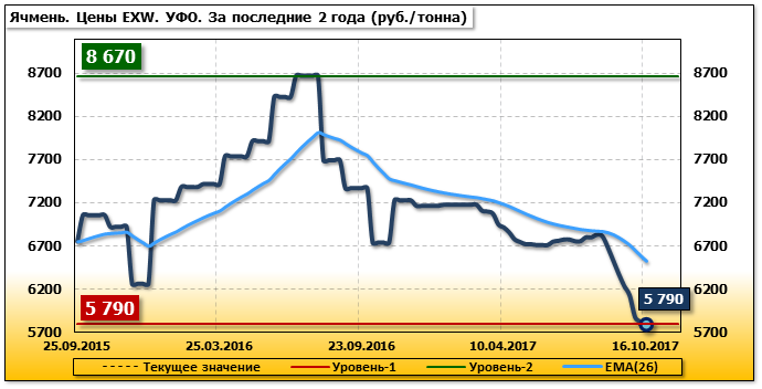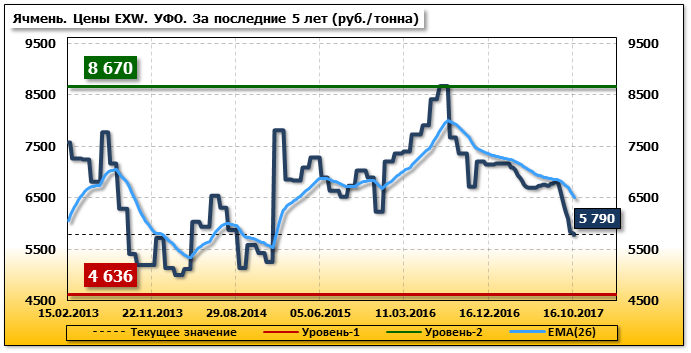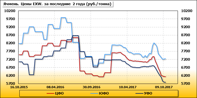 Внутренние цены на ячмень в Уральском федеральном округе упали на 20 руб./т. и на данный момент составляют 5 790 рублей за тонну.