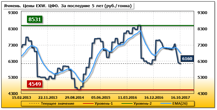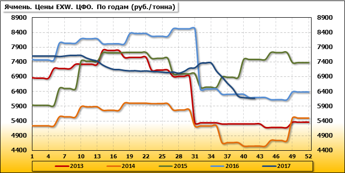 За прошедшую неделю в Центральном федеральном округе внутренние цены ячмень упали на 10 руб./т. и на данный момент составляют 6 160 рублей за тонну.