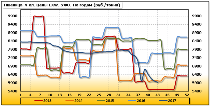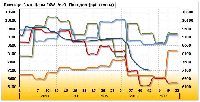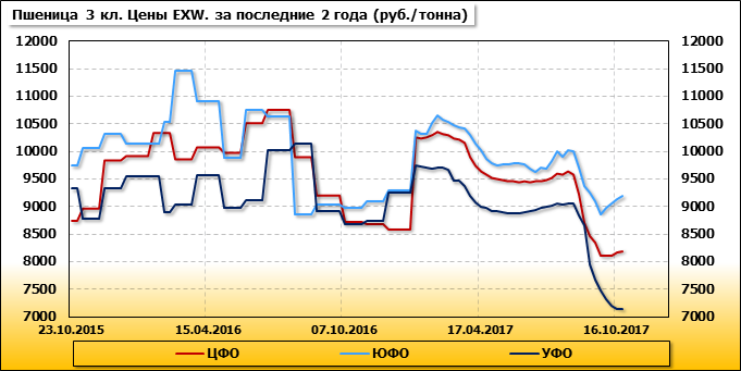 Внутренние цены на пшеницу 3 класса в Уральском федеральном округе упали на 30 руб./т. и на данный момент составляют 7 140 рублей за тонну.
