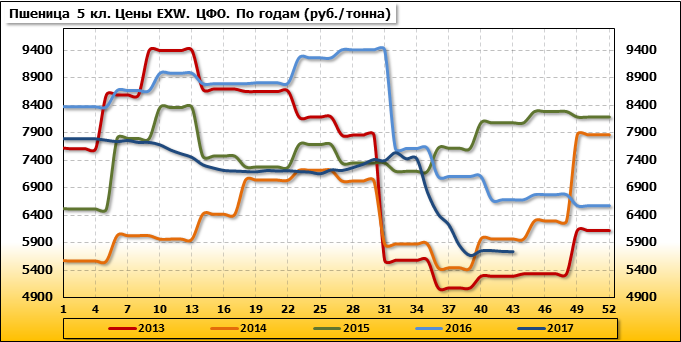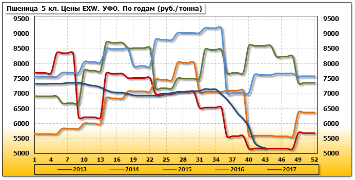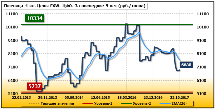 Цены на пшеницу 5-го класса понизились на 5 руб./т. и на данный момент составляют 5 730 рублей за тонну.