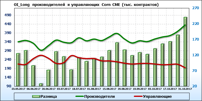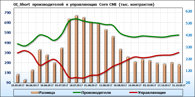 За прошедшую неделю разница между OI производителей и OI управляющих выросла на 42 586 контрактов. Разница между длинными позициями производителей и управляющих выросла на 56 198 контрактов. Разница между короткими позициями производителей и управляющих сократилась на 16 232 контрактов.