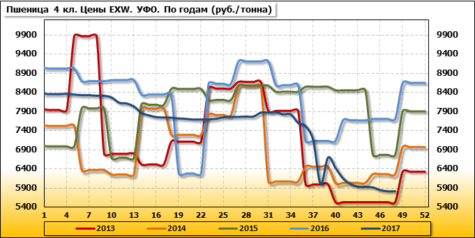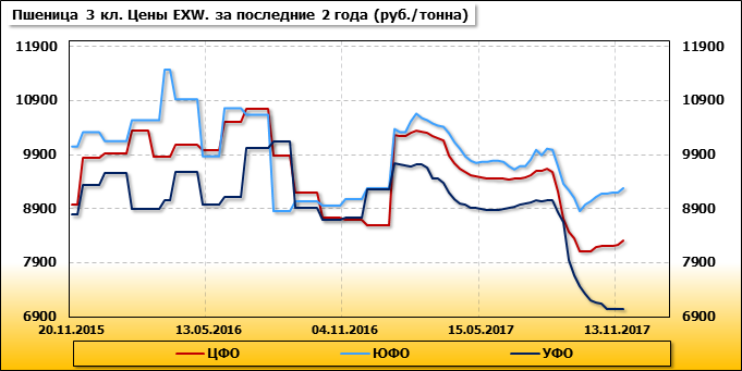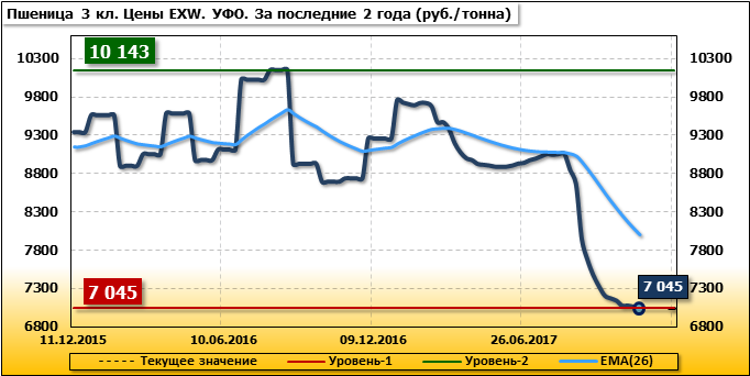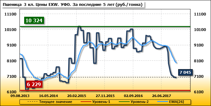 Внутренние цены на пшеницу 3 класса в Уральском федеральном округе упали на 15 руб./т. и на данный момент составляют 7 045 рублей за тонну.