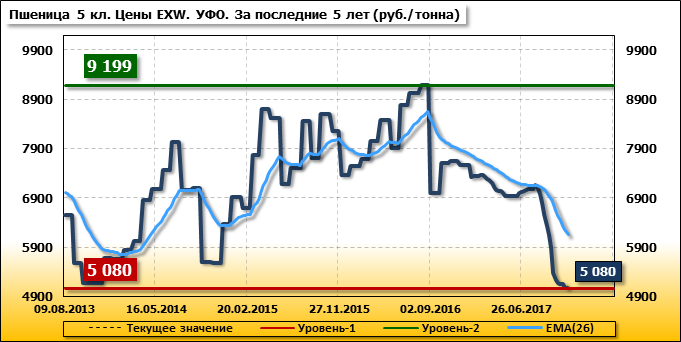 Цены на пшеницу 5-го класса понизились на 50 руб./т. и на данный момент составляют 5 080 рублей за тонну.
