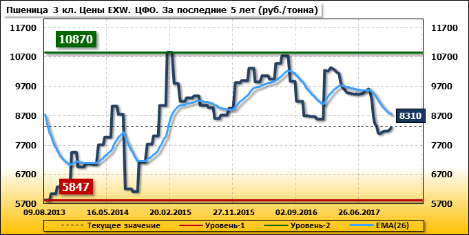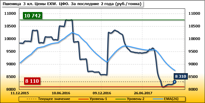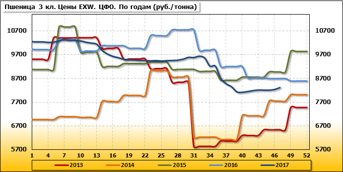За прошедшую неделю в Центральном федеральном округе внутренние цены на пшеницу 3 класса выросли на 80 руб./т. и на данный момент составляют 8 310 рублей за тонну.