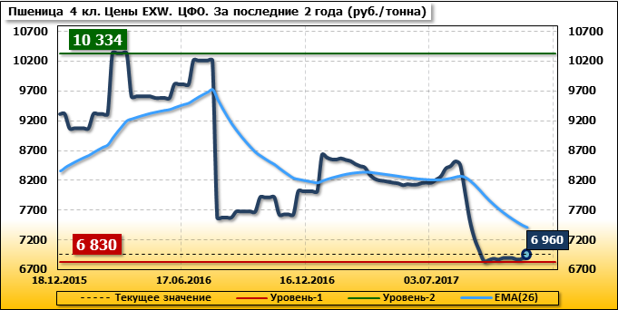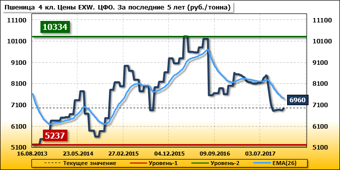 Цены на пшеницу 4-го класса поднялись на 90 руб./т. и на данный момент составляют 6 960 рублей за тонну.
