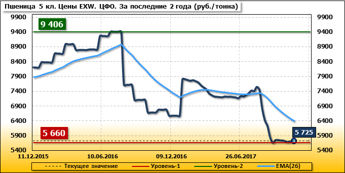 Цены на пшеницу 5-го класса повысились на 15 руб./т. и на данный момент составляют 5 725 рублей за тонну.
