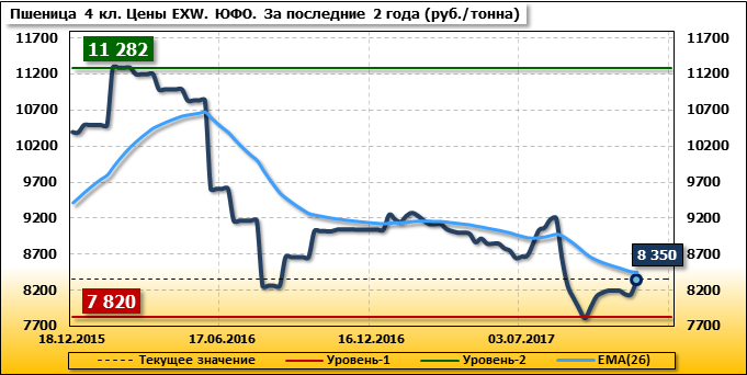 Цены на пшеницу 4-го класса поднялись на 200 руб./т. и на данный момент составляют 8 350 рублей за тонну.