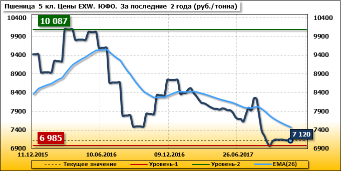 Цены на пшеницу 5-го класса понизились на 15 руб./т. и на данный момент составляют 7 120 рублей за тонну.